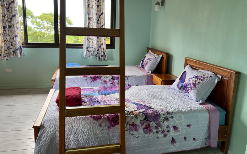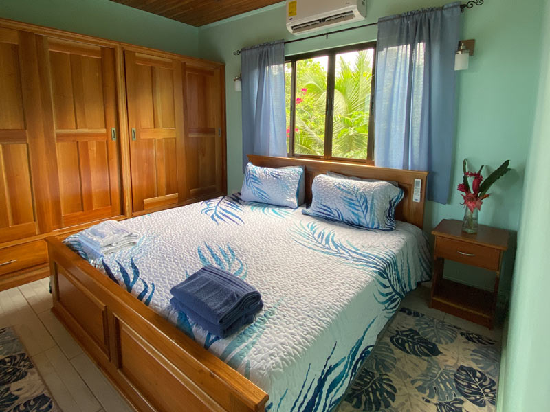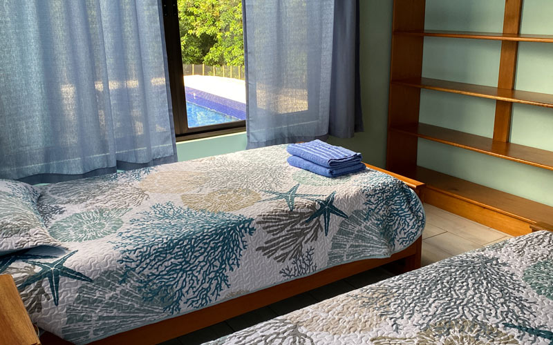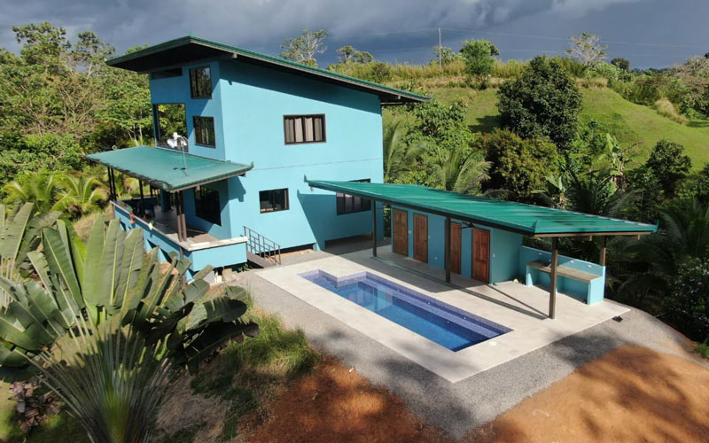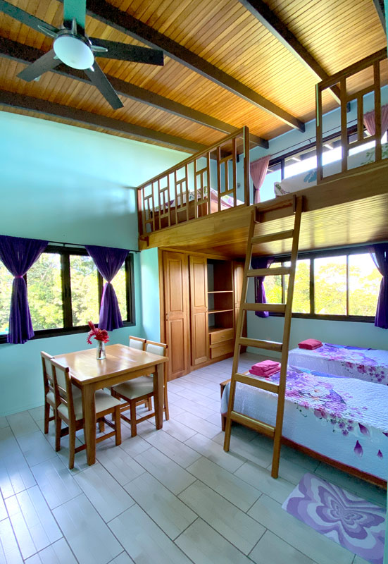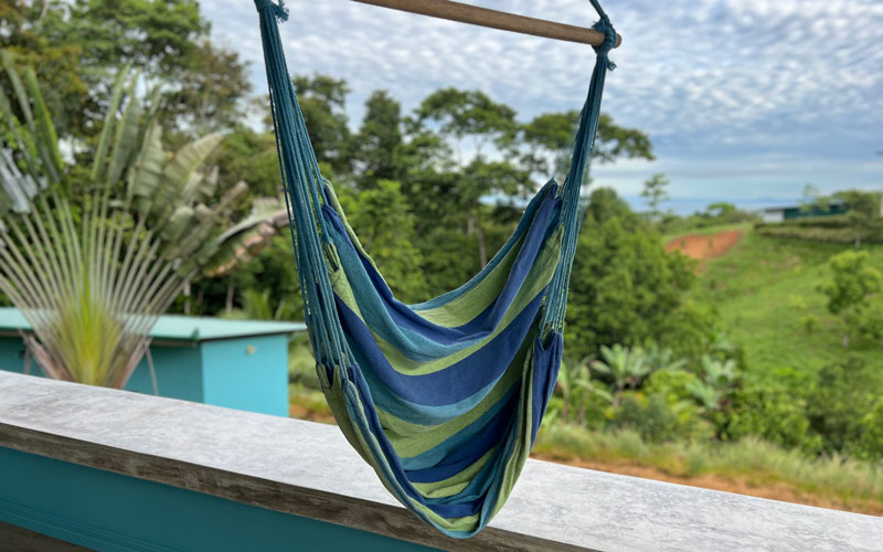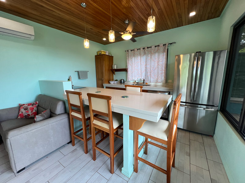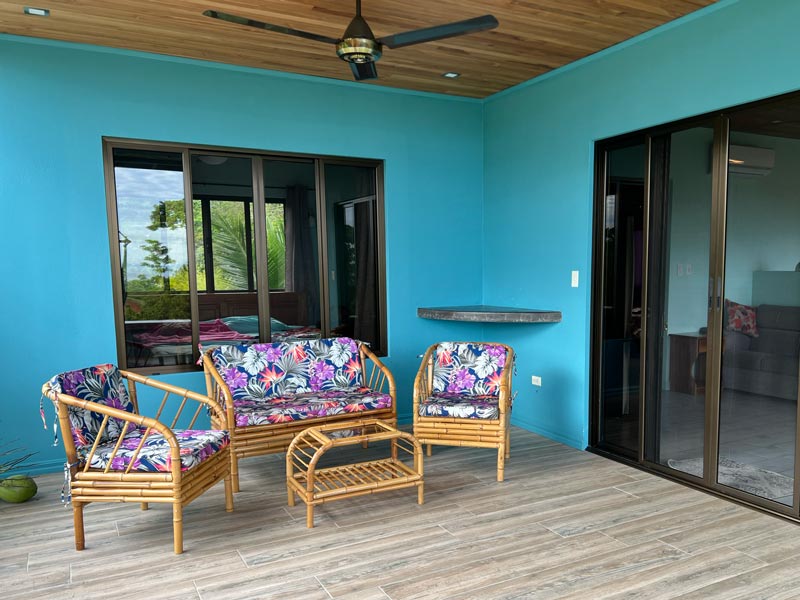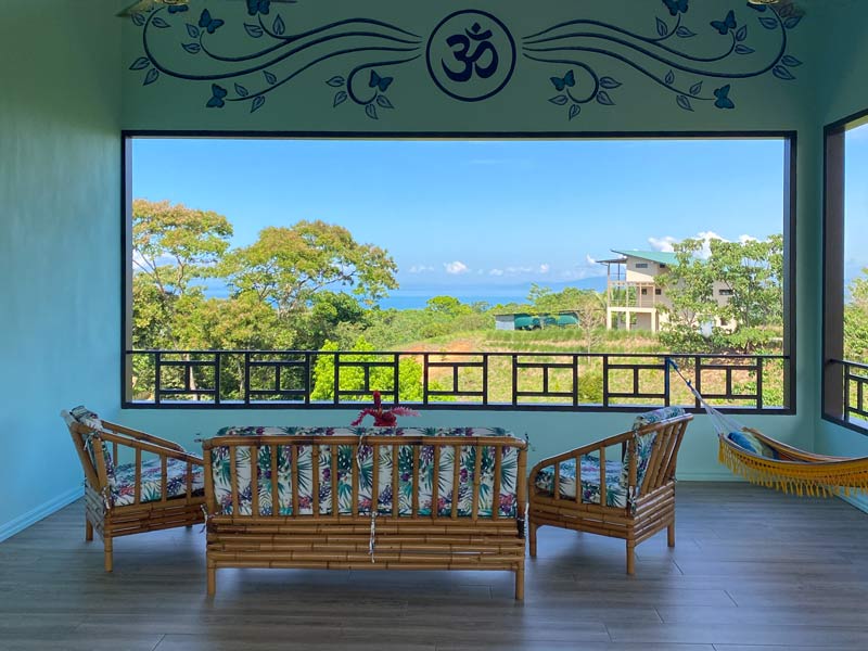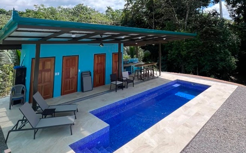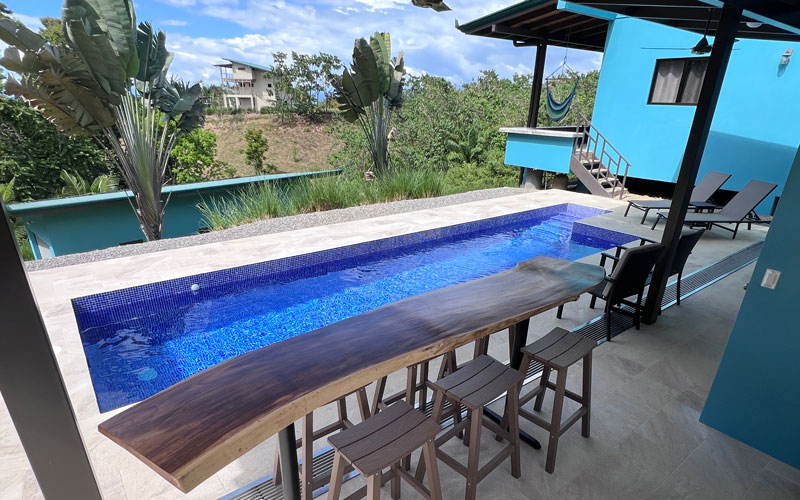 Casa Mariposa Azul boasts a modern and minimalist design, complemented by a 450-square-foot yoga pavilion that offers breathtaking views of the ocean and jungle. Enjoy the 40-foot-long lanai, complete with hanging chair hammocks—a perfect spot to grab a pair of binoculars for birdwatching.